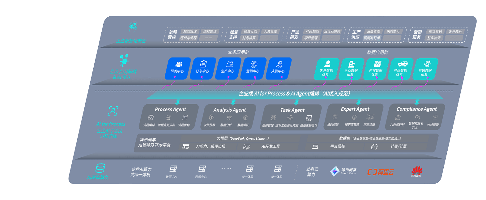 端到端的一站式AI工作空间深度融合了从企业战略规划到日常经营的全流程业务板块,,,定向解决车企内部领域多、、、、部门多、、链条长、、、场景碎片化等难题,,,支持车企快速构建以AI为核心的生产力写作体系,,实现任务执行与AI能力的无缝集成与交互
